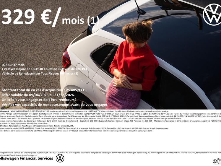 Résumé de l’annonce : Volkswagen Polo Polo 1.0 TSI 95 S&S DSG7 Life d’occasion, essence, 5 portes, à 20470 euros, de 2024 avec 9 998 km au compteur. Volkswagen Polo Polo 1.0 TSI 95 S&S DSG7 Life de couleur Bleu, 95 CH, 5 CV, avec garantie Garantie 60 mois et mis en vente par ESPACE 3000 BESANCON, un professionnel auto situé à sur Besançon , Doubs (25) dans la région Bourgogne-Franche-Comté.